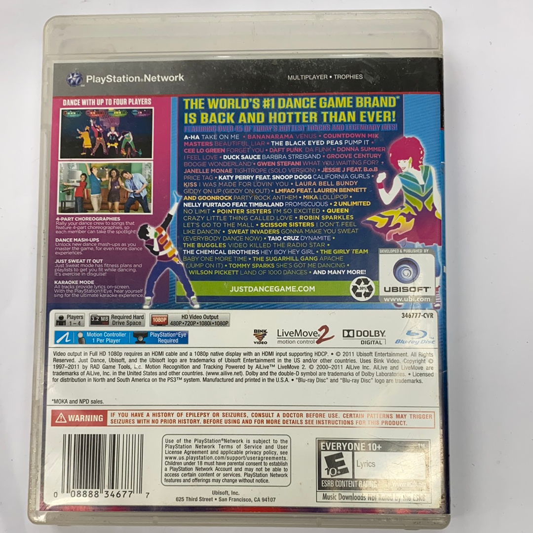 Just Dance 3 for Sony PlayStation 3 offers a great selection of music and helps you learn choreography from your favorite artists. Just Dance 3 for PS3 features over 45 songs from a wide variety genres and musicians. Artists and bands include The Sugarhill Gang, Katy Perry, The Chemical Brothers, Janelle Monae, Cee Lo Green, and Gwen Stefani. Songs feature radio hits such as “Baby One More Time” and “Party Rock Anthem” alongside soundtrack favorites such as “Let’s Go to the Mall” from “How I Met Your Mother.” Just Dance 3 for PlayStation 3 features the same gaming elements as previous versions of the series. The screen displays the choreography, and you earn points by perfecting your moves and working on your time. You can play on your own, take turns on the dance floor, or turn on Dance Crew mode to dance with up to four players. As you boost your score, you can unlock extras, such as Dance Mashups, extra songs, and new game modes. If you love to sing, switch on the karaoke feature to sing along with the songs on the screen. In Sweat Mode, you can get a workout as you dance. Sweat Mode boosts the activity level to help you break out a sweat as you dance. Sweat Mode also includes workout plans to go with your playlists, so you can create your own fitness plan to stay in shape. Just Dance 3 for PS3 requires one or more PlayStation Move controllers. These accessories contain motion sensors, which are essential for scoring your dance moves. The game does not require any other accessories, but you can get a boost out of your gameplay with a PlayStation Eye. PlayStation Eye accessories are digital web cameras that connect to your console. The microphone in the Eye can pick up vocals in karaoke mode, helping you access additional features in the game. Just Dance 3 for PlayStation 3 is the third installment in Ubisoft’s popular “Just Dance” games series. Its rating is E for Everyone. This rating means that it is appropriate for all ages, so you can play the video game with the entire family. The PS3 version features several exclusive songs that are absent from the Wii and Xbox 360 versions. The PS3 version is only compatible with PlayStation 3 games consoles. This version of Just Dance 3 is also not compatible with 3DS or PS Vita portable games consoles.